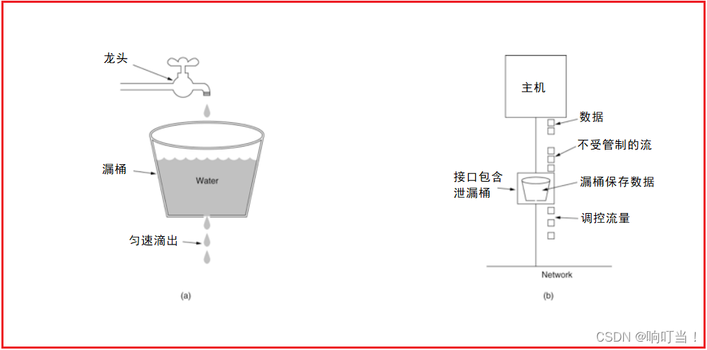 漏桶(Leaky Bucket)算法思路很简单,水(请求)先进入到漏桶里,漏桶以一定的速度出水(接口有响应速率),当水流入速度过大会直接溢出(访问频率超过接口响应速率),然后就拒绝请求,可以看出漏桶算法能强行限制数据的传输速率.示意图如下: