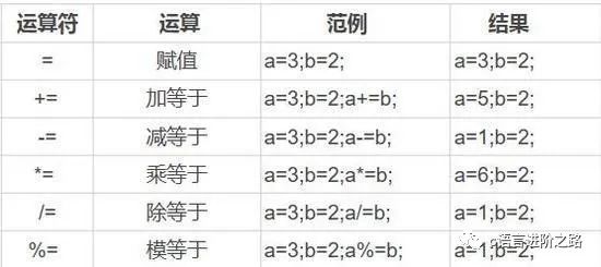 所以,表达式 x=+3就相当于 x = x + 3,先进行相加运算,在进行赋值。-=、*=、/=、%=赋值运算符都可依此类推。