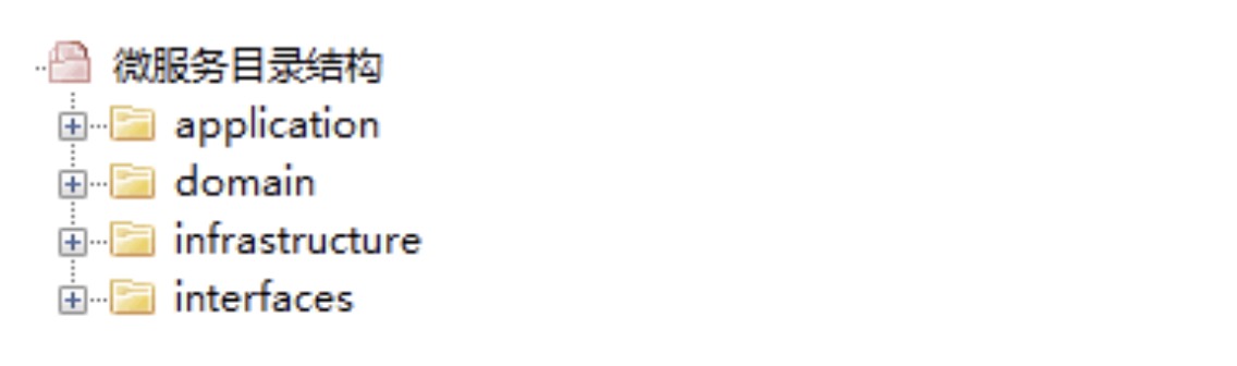 微服务一级目录是按照 DDD 分层架构的分层职责来定义的。从下面这张图中,我们可以看到,在代码模型里分别为用户接口层、应用层、领域层和基础层,建立了 interfaces、application、domain 和 infrastructure 四个一级代码目录。