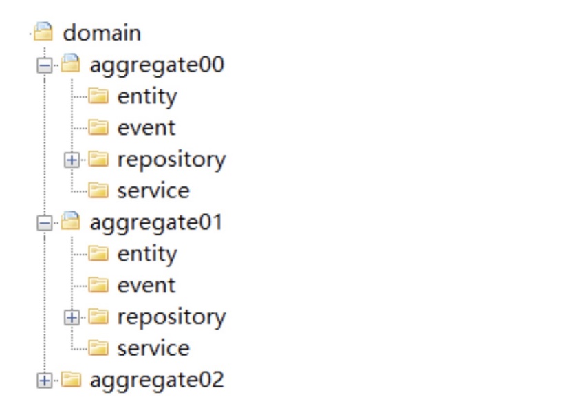 Domain 是由一个或多个聚合包构成,共同实现领域模型的核心业务逻辑。聚合内的代码模型是标准和统一的,包括:entity、event、repository 和 service四个子目录。