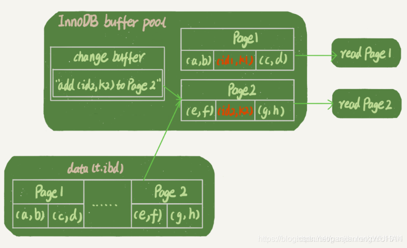 - Page 2 没有在内存中,就在内存的change buffer 区域,记录下“我要往 Page 2 插入一行”这个信息