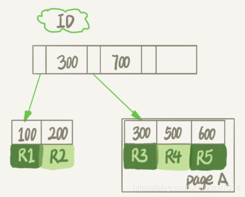 假设要删除R4,innodb只会标记R4删除。如果之后插入一个ID在300和600之间的记录时,可能会复用该位置。如果删掉整页,整个数据页可以被复用,所以磁盘文件大小不会缩小。