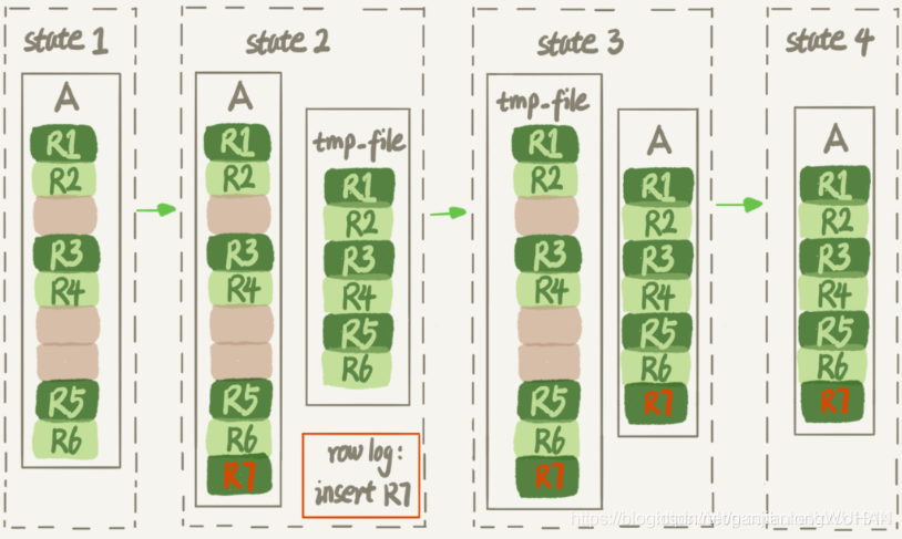 - 生成临时文件的过程中,将所有对 A 的操作记录在一个日志文件(row log)中,对应的是图中 state2 的状态;