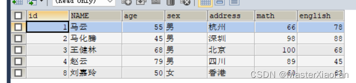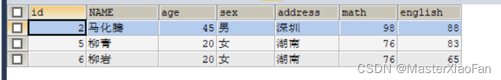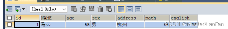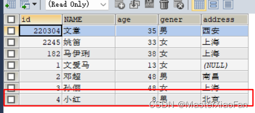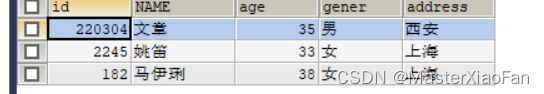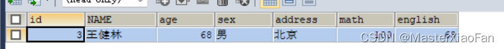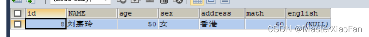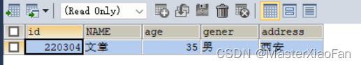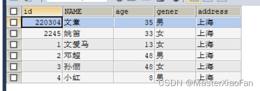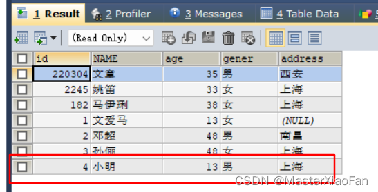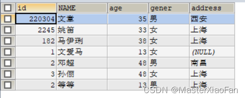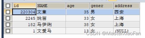 INSERT INTO student(id,NAME,age,gener)VALUES(1,'文爱马',13,'女'); 结果显示如下: