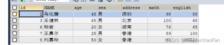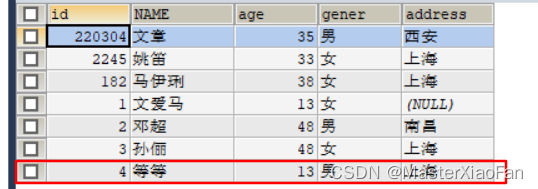 INSERT INTO student(id,NAME,age,gener,address)VALUES(2,'等等',13,'男','上海'); 结果显示如下: