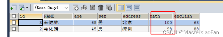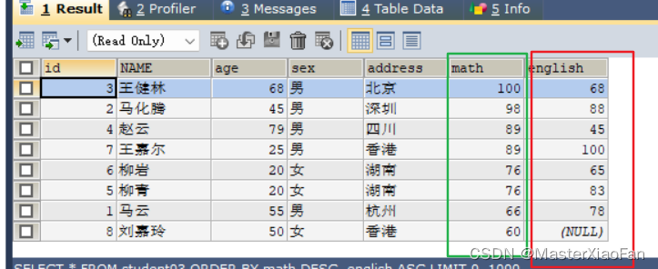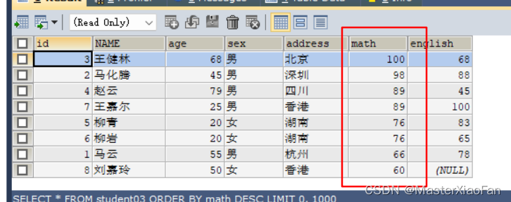 ORDER BY math DESC;结果显示
