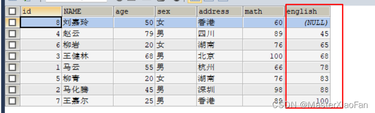 ORDER BY english ASC ;结果显示: