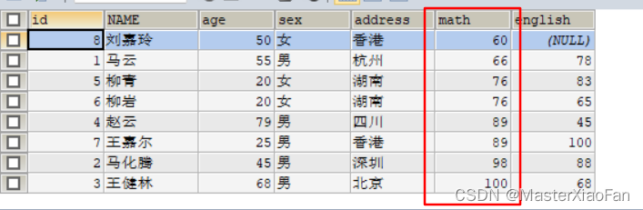 ORDER BY math ;-- 默认不写排序规则为升序,升序也可以使用关键字asc结果显示: