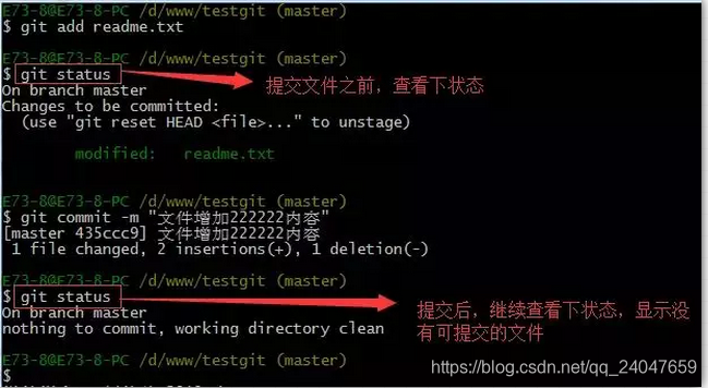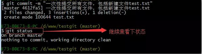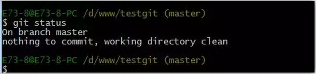 现在我们已经提交了一个readme.txt文件了,我们下面可以通过命令git status来查看是否还有文件未提交,如下: