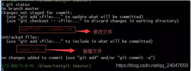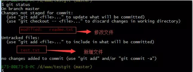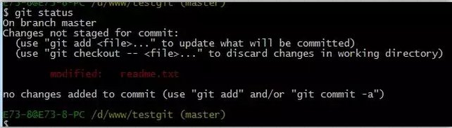 我们在readme.txt再添加一行内容为4444444,接着在目录下新建一个文件为test.txt 内容为test,我们先用命令 git status来查看下状态,如下: