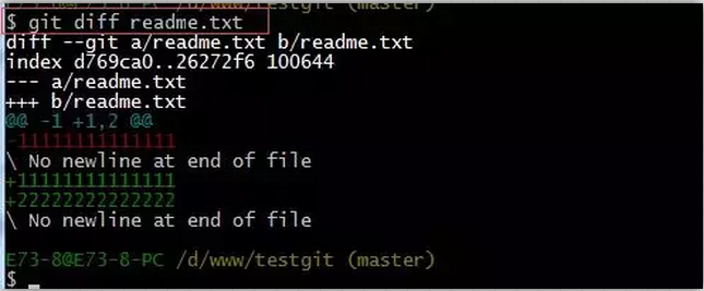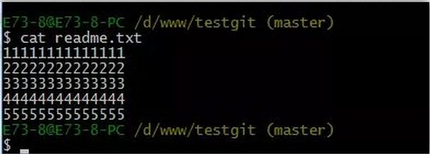 比如我现在在readme.txt文件里面增加一行 内容为555555555555,我们先通过命令查看如下: