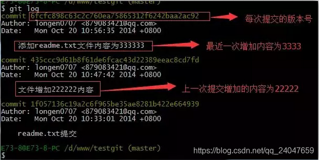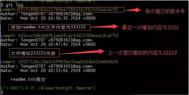 git log命令显示从最近到最远的显示日志,我们可以看到最近三次提交,最近的一次是,增加内容为333333.上一次是添加内容222222,第一次默认是 111111.如果嫌上面显示的信息太多的话,我们可以使用命令 git log –pretty=oneline 演示如下: