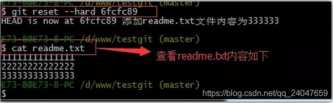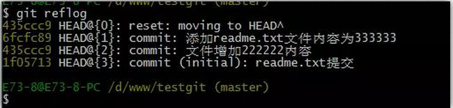 git reset --hard 版本号 ,但是现在的问题假如我已经关掉过一次命令行或者333内容的版本号我并不知道呢?要如何知道增加3333内容的版本号呢?可以通过如下命令即可获取到版本号:git reflog 演示如下: