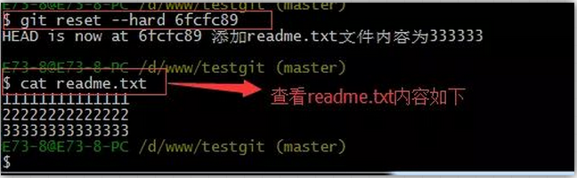 我们看到 增加333333 内容我们没有看到了,但是现在我想回退到最新的版本,如:有333333的内容要如何恢复呢?我们可以通过版本号回退,使用命令方法如下: