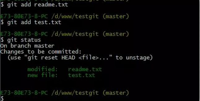现在我们先使用git add 命令把2个文件都添加到暂存区中,再使用git status来查看下状态,如下: