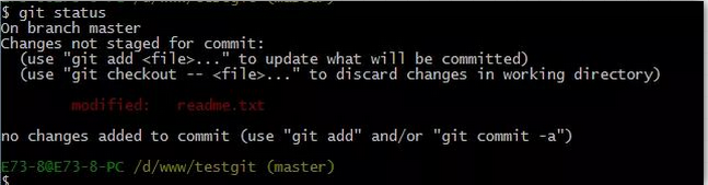 但是现在我不想使用上面的2种方法,我想直接想使用撤销命令该如何操作呢?首先在做撤销之前,我们可以先用 git status 查看下当前的状态。如下所示: