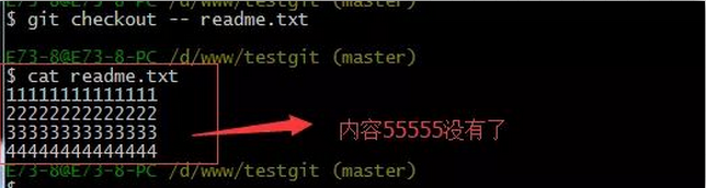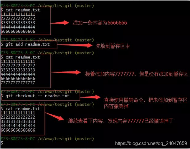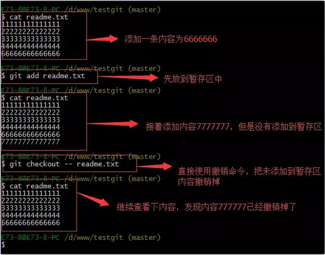 对于第二种情况,我想我们继续做demo来看下,假如现在我对readme.txt添加一行 内容为6666666666666,我git add 增加到暂存区后,接着添加内容7777777,我想通过撤销命令让其回到暂存区后的状态。如下所示: