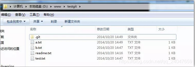 这时候你当前testgit目录下会多了一个.git的目录,这个目录是Git来跟踪管理版本的,没事千万不要手动乱改这个目录里面的文件,否则,会把git仓库给破坏了。如下: