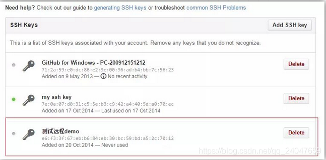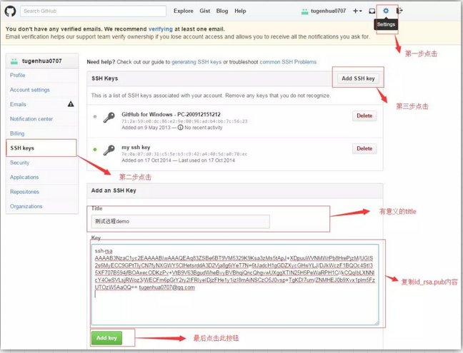 第二步:登录github,打开” settings”中的SSH Keys页面,然后点击“Add SSH Key”,填上任意title,在Key文本框里黏贴id_rsa.pub文件的内容。