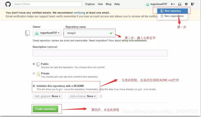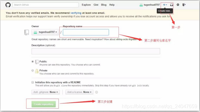 首先,登录github上,然后在右上角找到“create a new repo”创建一个新的仓库。如下: