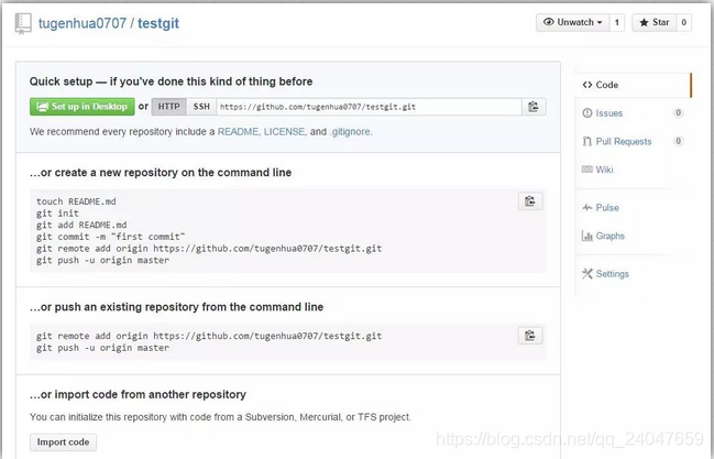 目前,在GitHub上的这个testgit仓库还是空的,GitHub告诉我们,可以从这个仓库克隆出新的仓库,也可以把一个已有的本地仓库与之关联,然后,把本地仓库的内容推送到GitHub仓库。