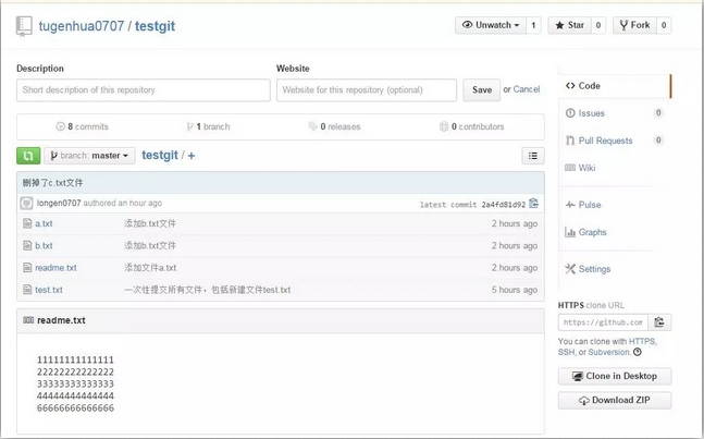 我在版本库testgit目录下新建一个记事本文件 readme.txt 内容如下:11111111