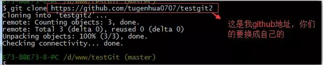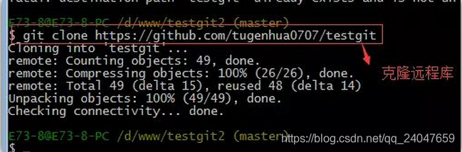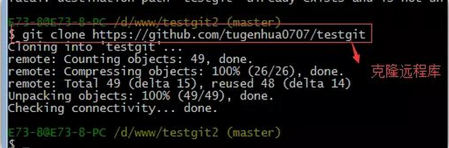 接着进入testgit2目录,进行克隆远程的库到本地来,如下: