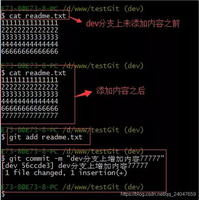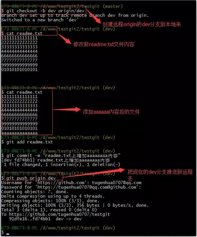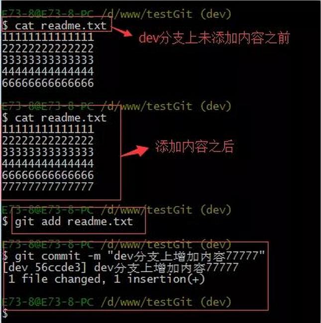 git branch查看分支,会列出所有的分支,当前分支前面会添加一个星号。然后我们在dev分支上继续做demo,比如我们现在在readme.txt再增加一行 7777777777777
