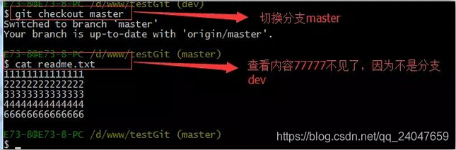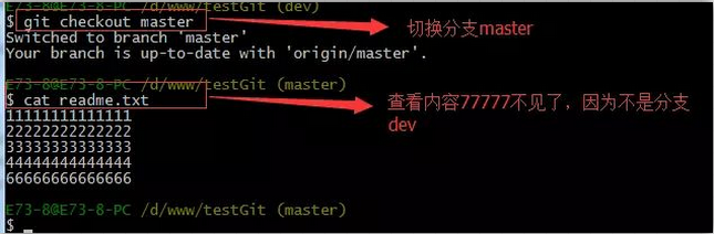 现在dev分支工作已完成,现在我们切换到主分支master上,继续查看readme.txt内容如下: