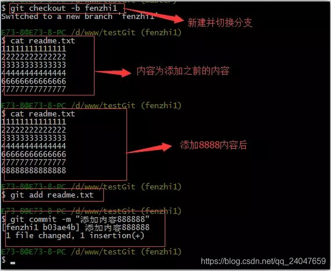 下面我们还是一步一步来,先新建一个新分支,比如名字叫fenzhi1,在readme.txt添加一行内容8888888,然后提交,如下所示:
