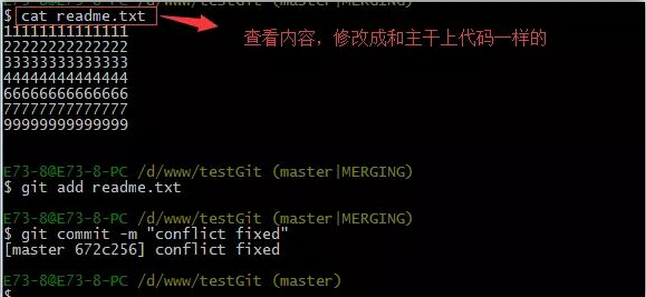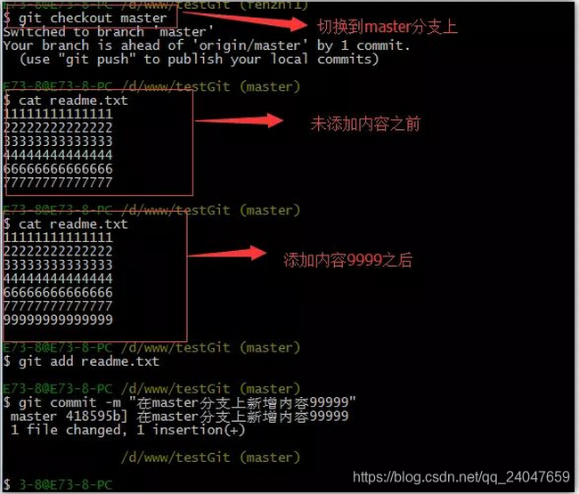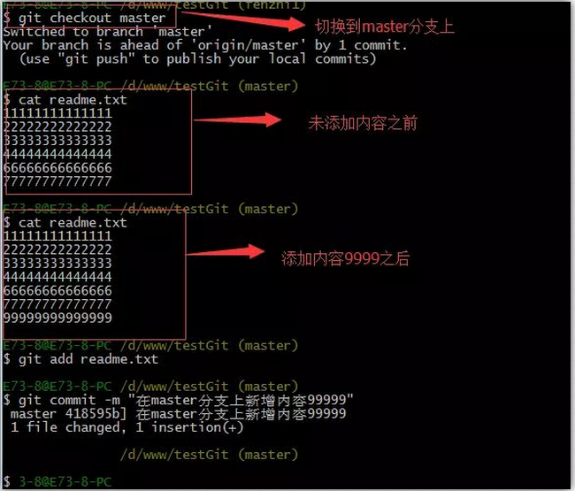 同样,我们现在切换到master分支上来,也在最后一行添加内容,内容为99999999,如下所示:
