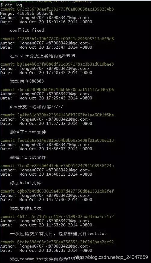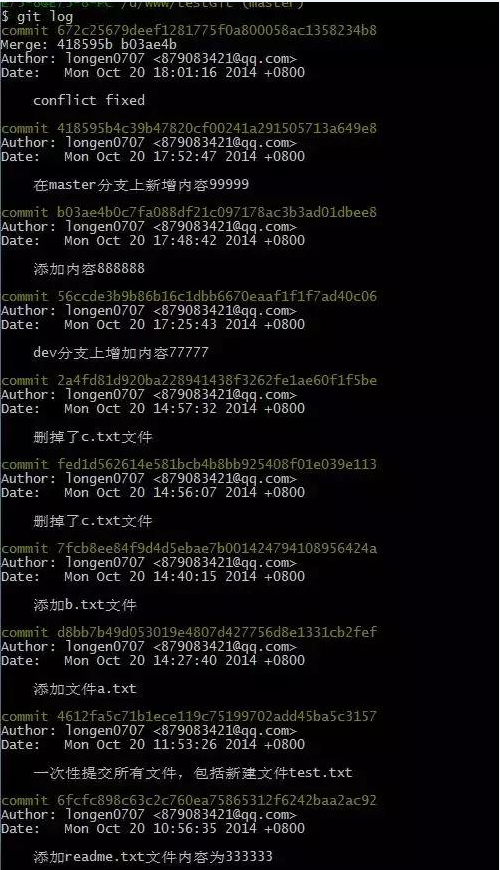 现在我已经对readme.txt文件做了三次修改了,那么我现在想查看下历史记录,如何查呢?我们现在可以使用命令 git log 演示如下所示: