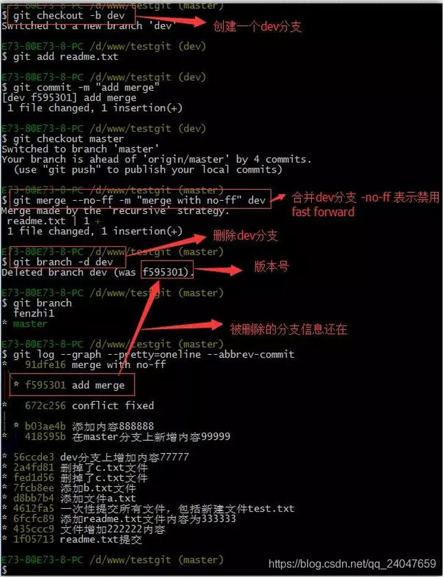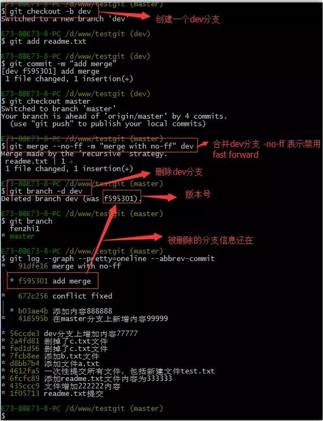 3.分支管理策略。 通常合并分支时,git一般使用”Fast forward”模式,在这种模式下,删除分支后,会丢掉分支信息,现在我们来使用带参数 –no-ff来禁用”Fast forward”模式。首先我们来做demo演示下: