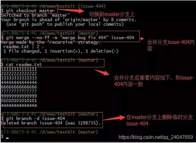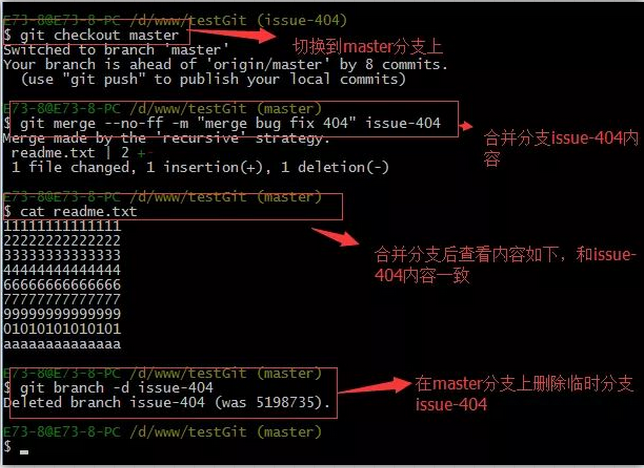 修复完成后,切换到master分支上,并完成合并,最后删除issue-404分支。演示如下: