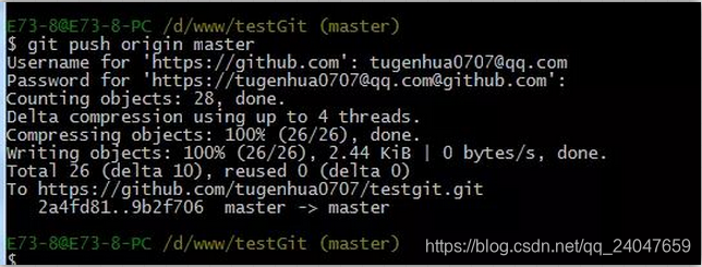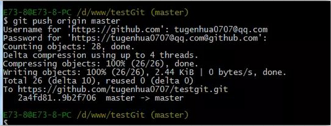由于远程库是空的,我们第一次推送master分支时,加上了 –u参数,Git不但会把本地的master分支内容推送的远程新的master分支,还会把本地的master分支和远程的master分支关联起来,在以后的推送或者拉取时就可以简化命令。推送成功后,可以立刻在github页面中看到远程库的内容已经和本地一模一样了,上面的要输入github的用户名和密码如下所示:
