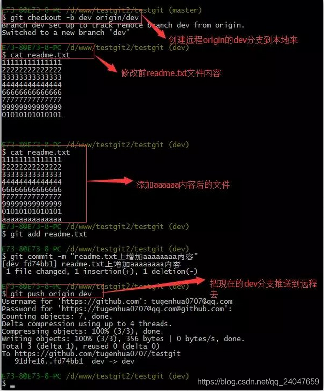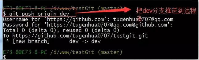 可以看到 推送成功了,如果我们现在要推送到其他分支,比如dev分支上,我们还是那个命令 git push origin dev