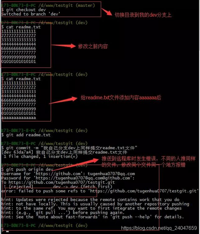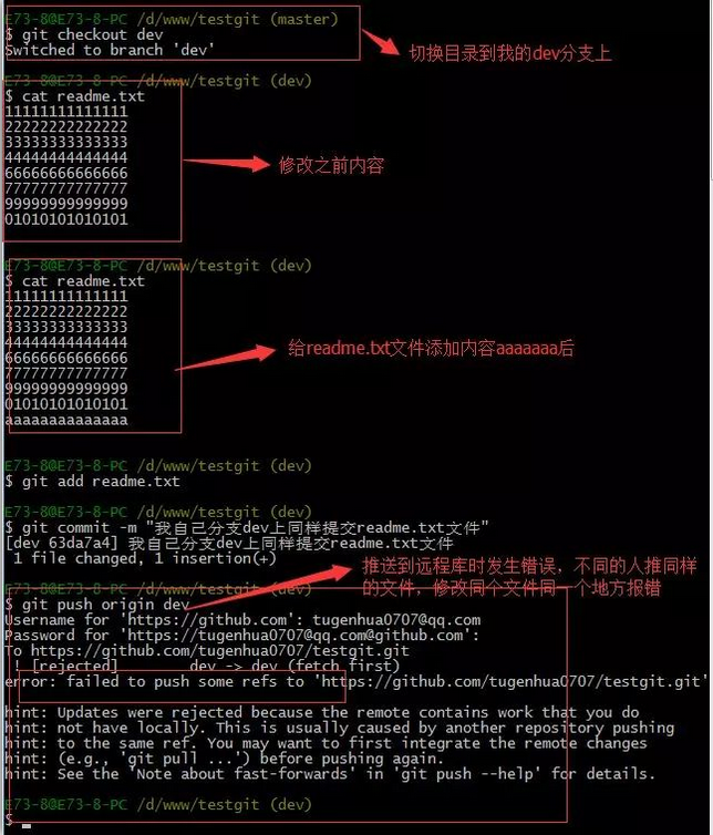 小伙伴们已经向origin/dev分支上推送了提交,而我在我的目录文件下也对同样的文件同个地方作了修改,也试图推送到远程库时,如下: