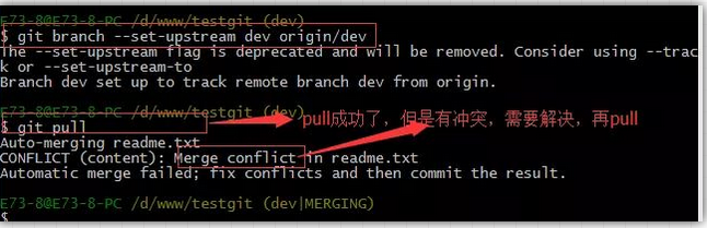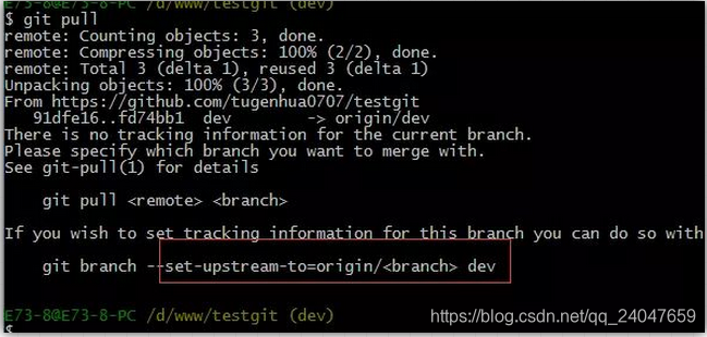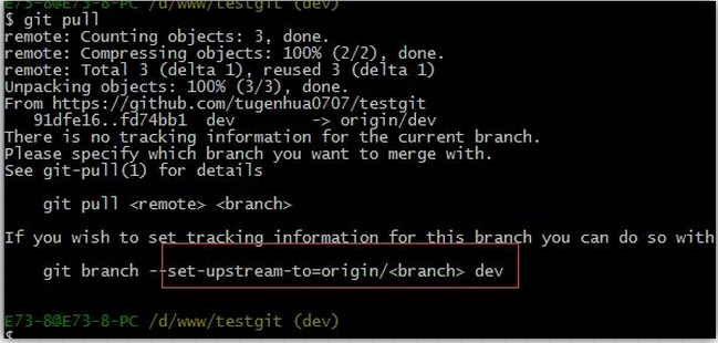 git pull也失败了,原因是没有指定本地dev分支与远程origin/dev分支的链接,根据提示,设置dev和origin/dev的链接:如下: