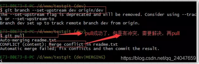 由上面可知:推送失败,因为我的小伙伴最新提交的和我试图推送的有冲突,解决的办法也很简单,上面已经提示我们,先用git pull把最新的提交从origin/dev抓下来,然后在本地合并,解决冲突,再推送。