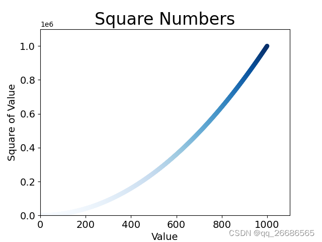 plt.scatter(x_values, y_values, c=(0, 0, 0.8), edgecolor='none', s=40)5.使用颜色映射表