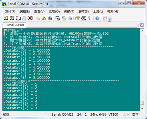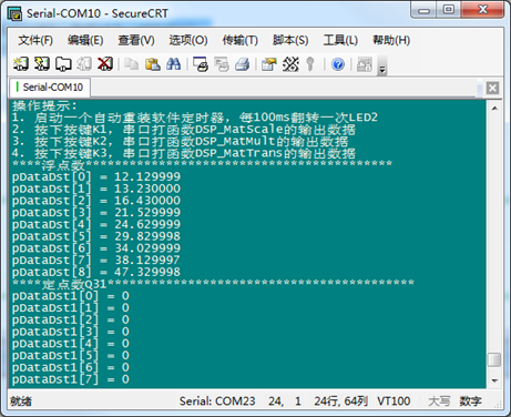- 按下按键K1,串口打函数DSP_MatScale的输出数据。