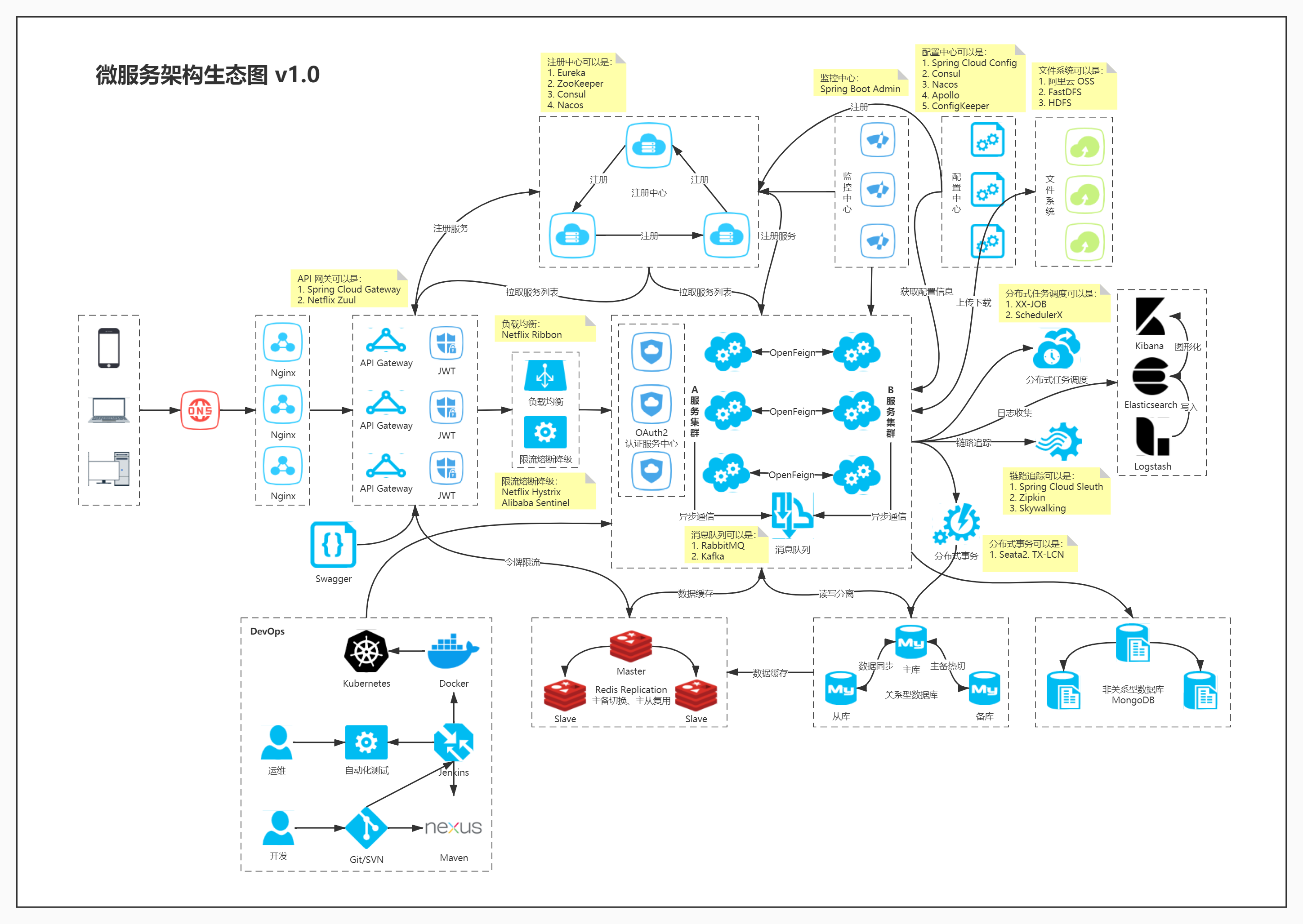 RibbitMQ:RabbitMQ 是部署最广泛的开源消息中间件。是实现了高级消息队列协议(AMQP)的开源消息中间件。Kafka:Kafka 是由 Apache 软件基金会开发的一个开源流处理平台,由Scala和Java编写。Kafka 是一种高吞吐量的分布式发布订阅消息系统。Redis:Redis(Remote Dictionary Server ),即远程字典服务,是一个开源的使用 ANSI C 语言编写、支持网络、可基于内存亦可持久化的日志型、Key-Value 数据库,并提供多种语言的 API。MongoDB:MongoDB 是一个介于关系数据库和非关系数据库之间的产品,是非关系数据库当中功能最丰富,最像关系数据库的。它支持的数据结构非常松散,是类似 json 的 bson 格式,因此可以存储比较复杂的数据类型。Elasticsearch:Elasticsearch 是一个基于 Lucene 的搜索服务器。它提供了一个分布式多用户能力的全文搜索引擎,基于 RESTful web 接口。Elasticsearch 是最受欢迎的企业搜索引擎,其次是 Apache Solr,也是基于 Lucene。MySQL:MySQL 是一种开放源代码的关系型数据库管理系统(RDBMS),免费、简单、占资源少、强大好用。Oracle:世界上最昂贵的数据库,一般金融系统使用居多。FastDFS:FastDFS是一个开源的轻量级分布式文件系统,它对文件进行管理,功能包括:文件存储、文件同步、文件访问(文件上传、文件下载)等,解决了大容量存储和负载均衡的问题。特别适合以文件为载体的在线服务,如相册网站、视频网站等等。HDFS:Hadoop 生态组件,可以支持千万级的大型分布式文件系统。XX-JOB:轻量级分布式任务调度平台,其核心设计目标是开发迅速、学习简单、轻量级、易扩展。现已开放源代码并接入多家公司线上产品线,开箱即用。TX-LCN:分布式事务解决防范,LCN 并不生产事务,LCN 只是本地事务的搬用工(事务的协调工)。LCN 是一个高性能的分布式事务框架,兼容 Dubbo、Spring Cloud,支持 RPC 框架拓展,支持各种 ORM 框架、NoSQL、负载均衡、事务补偿。Zipkin:Twitter 公司开发贡献的一款开源的分布式实时数据追踪系统(Distributed Tracking System),基于 Google Dapper 的论文设计而来,其主要功能是聚集各个异构系统的实时监控数据。Skywalking:Apache Skywalking 是一个开源的,用于收集、分析,聚合,可视化来自于不同服务和本地基础服务的数据的可观察的平台。特别为分布式系统而设计的数据观察和监控系统。Apollo:携程框架部门研发的分布式配置中心,能够集中化管理应用不同环境、不同集群的配置,配置修改后能够实时推送到应用端,并且具备规范的权限、流程治理等特性,适用于微服务配置管理场景。ConfigKeeper:随行付架构部基于 Spring Cloud 研发的分布式配置中心。与 Spring Boot、Spring Cloud 应用无缝兼容。JWT:JSON Web Token(JWT)是一个非常轻巧的规范。这个规范允许我们使用 JWT 在用户和服务器之间传递安全可靠的信息。Nginx:Nginx 是一款轻量级的 Web 服务器/反向代理服务器及电子邮件(IMAP/POP3)代理服务器,其特点是占有内存少,并发能力强,中国大陆使用 Nginx 网站用户有:百度、淘宝、腾讯、京东、新浪、网易等。Git:开源的分布式版本控制系统,可以有效、高速地处理从很小到非常大的项目版本管理。Docker:Docker 是一个开源的应用容器引擎,让开发者可以打包他们的应用以及依赖包到一个可移植的镜像中,然后发布到任何流行的 Linux 或 Windows 机器上,也可以实现虚拟化。容器是完全使用沙箱机制,相互之间不会有任何接口。Kubernetes:Kubernetes,简称 k8s,是用 8 代替 8 个字符“ubernete”而成的缩写。Kubernetes 脱胎于 Google 的 Borg 系统,是一个开源的功能强大的容器编排系统,用于管理云平台中多个主机上的容器化的应用,实现了容器集群的自动化部署、扩容以及运维的开源平台。Kubernetes 的目标是让部署容器化的应用简单并且高效。