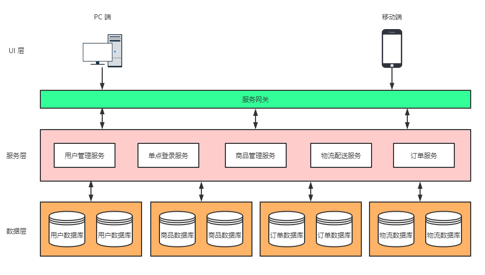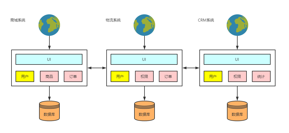 - 项目与项目之间存在数据冗余,耦合性较大,比如上图中三个项目都存在用户信息。
