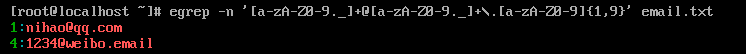 【root@localhost ~】egrep -n '[a-zA-Z0-9._]+@[a-zA-Z0-9._]+\.[a-zA-Z0-9]{1,3}' email.txt