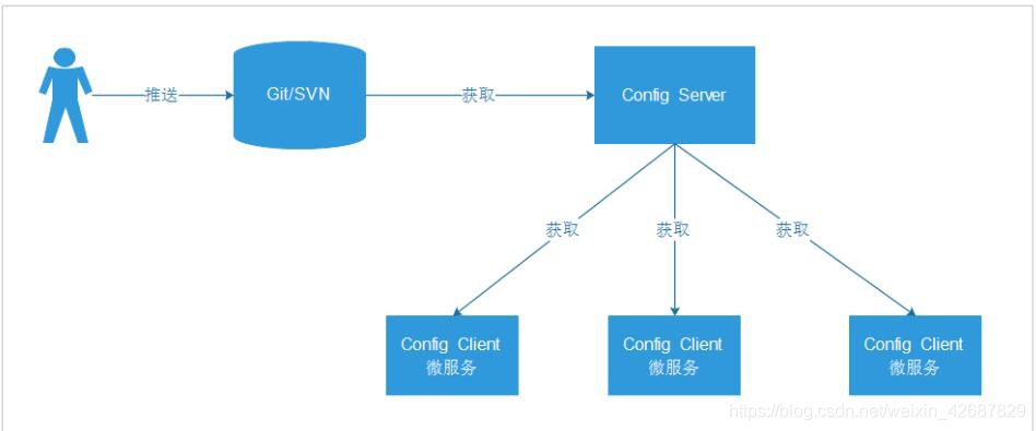 SpringCloud Config是SpringCloud团队创建的一个全新项目,用来为分布式系统中的基础设施和微服务应用提供集中化的外部配置支持,它分为服务端与客户端两个部分。其中服务端也称为分布式配置中心,它是一个独立的微服务应用,用来连接配置仓库并为客户端提供获取配置信息、加密 / 解密信息等访问接口;而客户端则是微服务架构中的各个微服务应用或基础设施,它们通过指定的配置中心来管理应用资源与业务相关的配置内容,并在启动的时候从配置中心获取和加载配置信息。SpringCloud Config实现了对服务端和客户端中环境变量和属性配置的抽象映射,所以它除了适用于Spring构建的应用程序之外,也可以在任何其他语言运行的应用程序中使用。由于SpringCloud Config实现的配置中心默认采用Git来存储配置信息,所以使用SpringCloud Config构建的配置服务器,天然就支持对微服务应用配置信息的版本管理,并且可以通过Git客户端工具来方便的管理和访问配置内容,当然它也提供了对其他存储方式的支持,比如:GIT仓库、SVN 仓库、本地化文件系统,其架构如下图:
