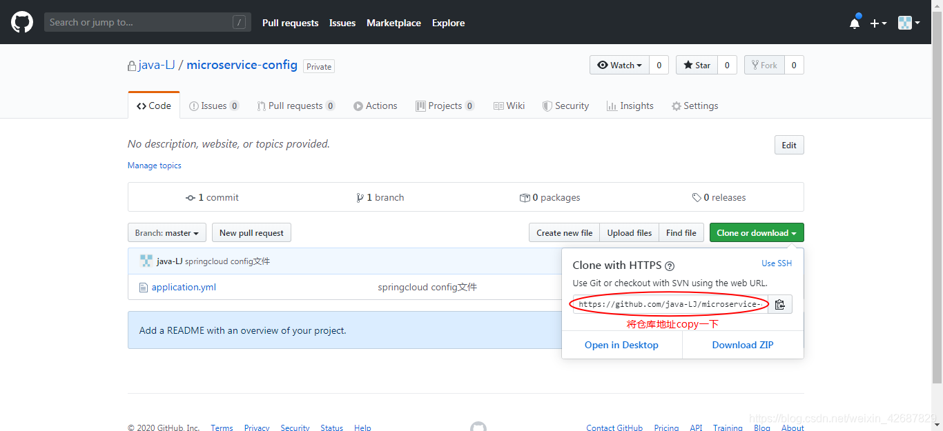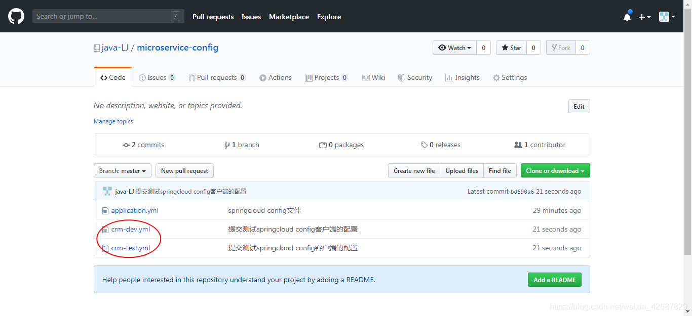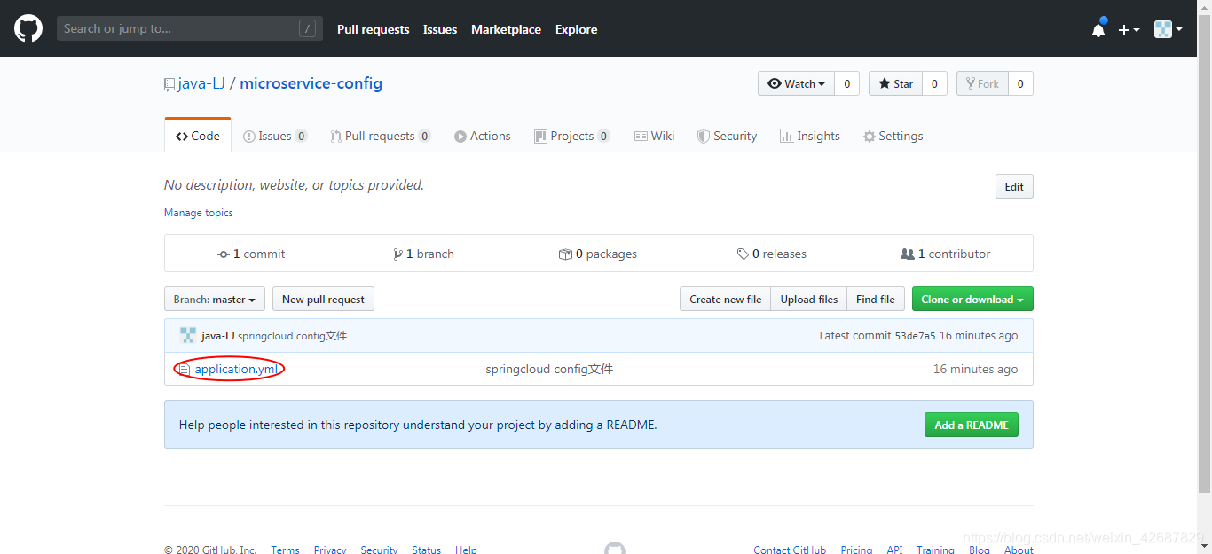 先登录GitHub建个仓库microservice-config,然后Git下载到本地;再上传一个配置文件到git仓库: