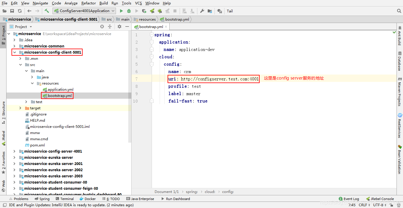 </dependency>因为项目启动的时候,就要调用server config端获取配置信息,所以这里需要一个bootstrap.yml配置文件(该文件的优先级比application.yml要高):