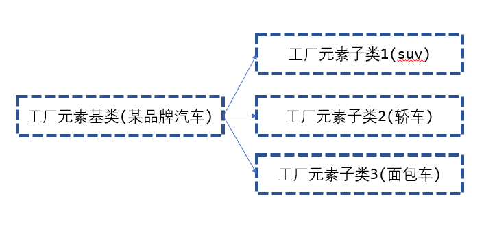首先是要定义和规划我们工厂模式创建出来的对象,我们可以成为”工厂元素”。这些工厂元素都属于不同的类型(上面例子中的不同型号的某品牌汽车),这些类型都属于同一个基类(某品牌汽车,具有汽车的通用功能)。所以工厂元素的设计规划就是 基类+子类的模式,基类提供对外使用的接口(如汽车的功能), 而子类定义具体的不同的类型。如果要新增一种类型,那么只要继承自这个基类就可以了。