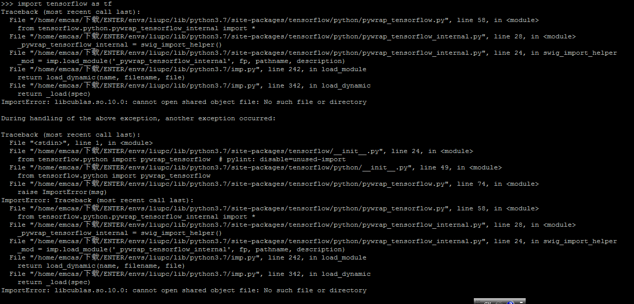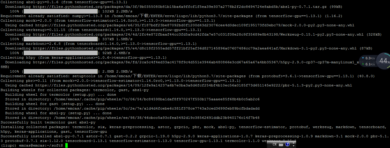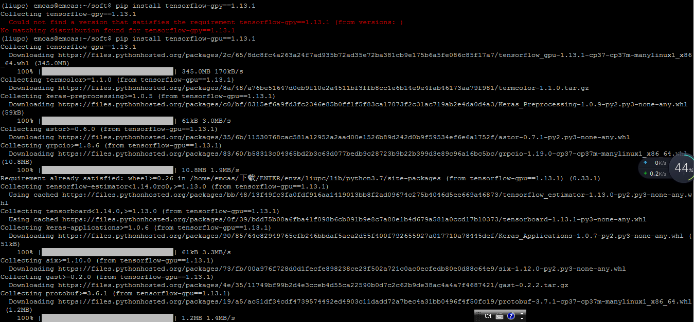 步骤6:安装tensorflow conda activate liupc //先进入自己的环境,在自己的环境下安装TensorFlow,供自己用。 输入以下命令: pip install tensorflow-gpu==1.13.1