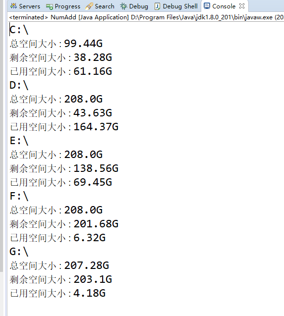 System.out.println("已用空间大小 : " + usedSpaceG + "G");